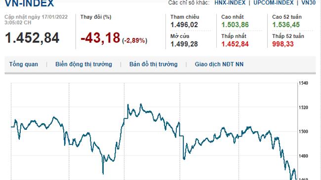 Kết phiên 17/1, VN-Index giảm 43,18 điểm (2,89%) còn 1.452,84 điểm, HNX-Index giảm 21,52 điểm (4,61%) xuống 445,34 điểm, UPCoM-Index giảm 2,86 điểm (2,55%) xuống 109,36 điểm.