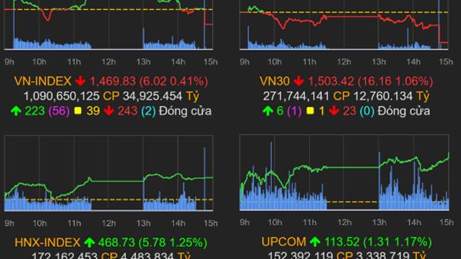 Kết phiên 18/11, VN-Index giảm 6,02 điểm (0,41%) còn 1.469,83 điểm, HNX-Index tăng 5,78 điểm (1,25%) lên 468,73 điểm, UPCom-Index tăng 1,17% lên 113,52 điểm.