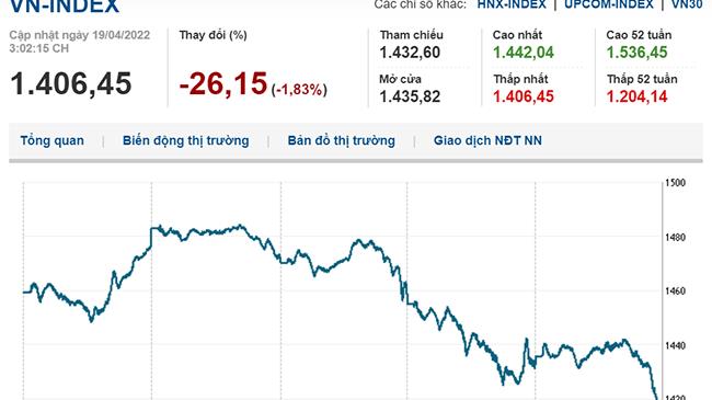 Đóng cửa phiên 19/4, VN-Index giảm 26,15 điểm (1,83%) còn 1.406,45 điểm, HNX-Index giảm 10,43 điểm (2,59%) xuống 392,69 điểm, UPCoM-Index giảm 1,89 điểm (1,71%) về 108,32 điểm.