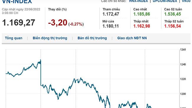 Đóng cửa phiên 22/6, VN-Index giảm 3,2 điểm (0,27%) về 1.169,27 điểm, HNX-Index tăng 4,77 điểm (1,8%) lên 269,39 điểm, UPCoM-Index tăng 0,6 điểm (0,71%) đạt 85,63 điểm.