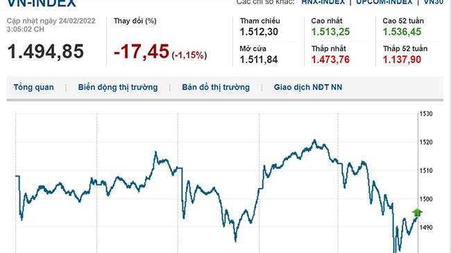 Đóng cửa phiên 24/2, VN-Index giảm 17,45 điểm (1,15%) xuống 1.494,85 điểm, HNX-Index giảm 7,66 điểm (1,73%) còn 434,88 điểm, UPCoM-Index giảm 1,19 điểm (1,05%) xuống 112,32 điểm.