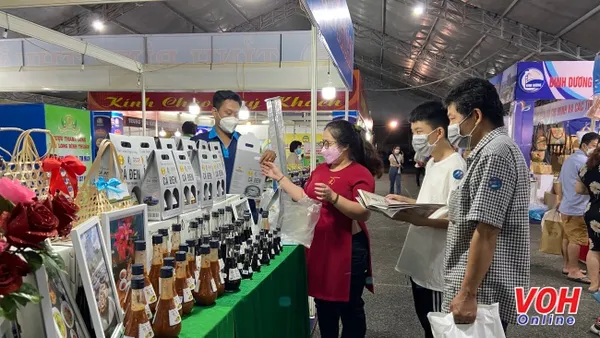 Tham gia sự kiện này, chị Trần Thị Kim Lĩnh (Bình Thuận) mang gần 300 cặp nước ép lên men thanh long đỏ và thêm các sản phẩm mới là mứt, si rô thanh long đỏ vào triển lãm. Theo tính toán của chị, năm nay dịch Covid-19 phức tạp nên chị đem ít hàng hơn năm 2020, nhưng dù vậy, quầy hàng ít khách mua sắm. “Năm ngoái, ngày đầu tiên khai mạc các gian hàng đều rất đông người mua sắm. 600 cặp nước ép lên men thanh long bán sạch trơn. Nhưng năm nay, ngồi đến tối cũng chỉ có vài khách ghé tham quan. Mặc dù, chúng tôi có giới thiệu thêm sản phẩm mới nhưng khách cũng ngại tháo khẩu trang để thử sản phẩm."