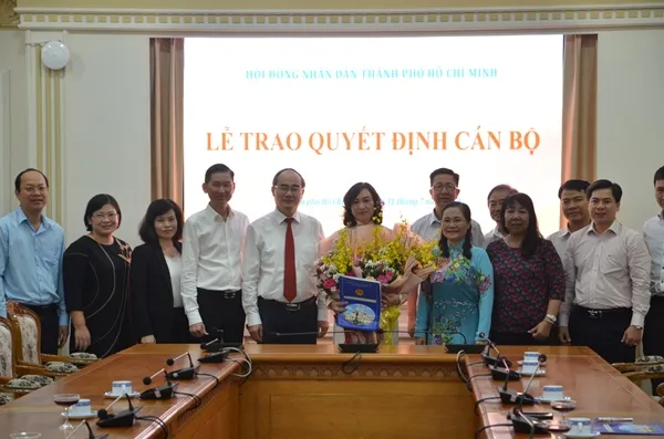 Bà Phan Thị Thắng Phó Chủ tịch Hội đồng nhân dân TP nhận quyết định và hoa chúc mừng tại buổi lễ trao nghị quyết.