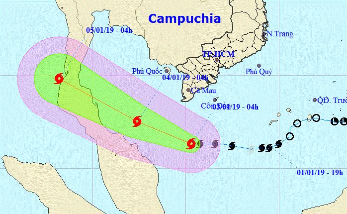 Dự báo trong 24 giờ tới, bão di chuyển theo hướng Tây Tây Bắc, mỗi giờ đi được khoảng 15km. Đến 04 giờ ngày 04/01, vị trí tâm bão ở khoảng 7,5 độ Vĩ Bắc; 102,4 độ Kinh Đông, cách mũi Cà Mau khoảng 280km về phía Tây Tây Nam, cách đảo Thổ Chu (Kiên Giang) khoảng 230km về phía Nam Tây Nam. Sức gió mạnh nhất vùng gần tâm bão mạnh cấp 8-9 (60-90km/giờ), giật cấp 11. Bán kính gió mạnh cấp 6, giật cấp 8 khoảng 120km tính từ tâm bão.