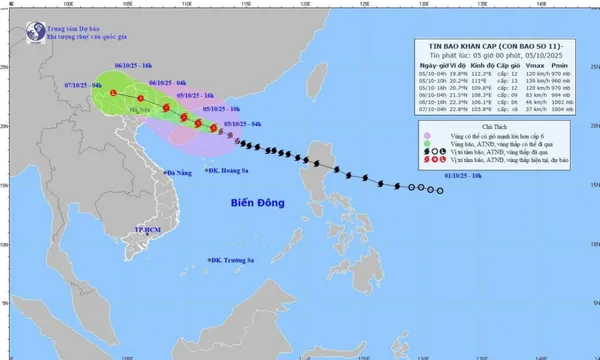 Sáng 5/10, Trung tâm Dự báo khí tượng thủy văn Quốc gia cho biết bão số 11 đang hoạt động mạnh trên vùng biển Tây Bắc Biển Đông, cách Quảng Ninh khoảng 550 km.