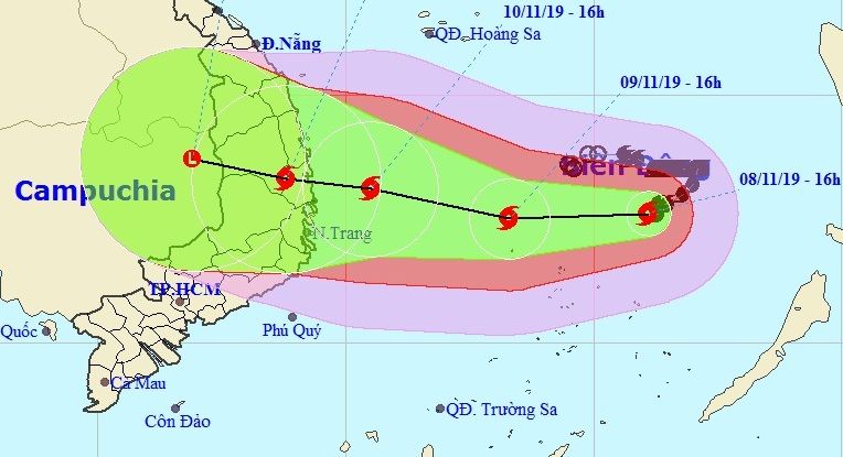 Dự báo trong 24 giờ tới, bão di chuyển chủ yếu theo hướng Tây, mỗi giờ đi được 5-10km và có khả năng mạnh thêm. Đến 16 giờ ngày 9/11, vị trí tâm bão ở khoảng 12,5 độ Vĩ Bắc; 113,3 độ Kinh Đông, cách đảo Song Tử Tây khoảng 170km về phía Bắc Tây Bắc, cách bờ biển các tỉnh từ Quảng Ngãi đến Khánh Hòa khoảng 430km về phía Đông. Sức gió mạnh nhất vùng gần tâm bão mạnh cấp 12 (115-135km/giờ), giật cấp 15.