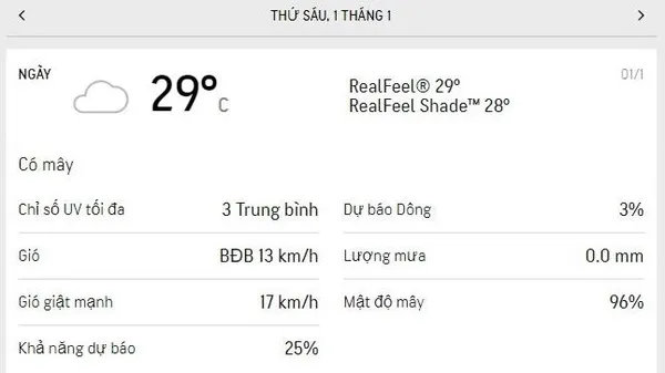 Chiều 1/1/2021 trời gió nhẹ, nhiệt độ cao nhất 29 độ C lúc 13-14 giờ (Nguồn: Accuweather)