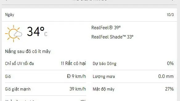 Sáng ngày 10/3, TPHCM có nhiệt độ dịu mát, mật độ mây trung bình 36%, giữa trưa có nắng (Nguồn: Accuweather)