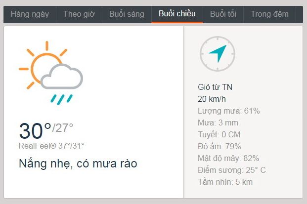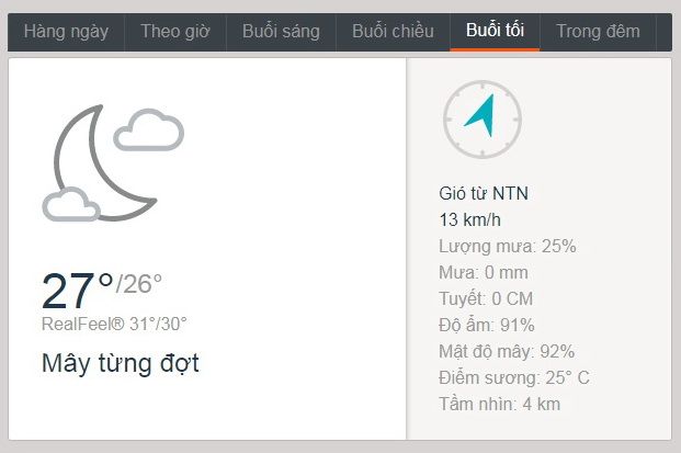 - Nhiệt độ buổi chiều trong khoảng 27-30 độ C. Độ ẩm trung bình 79%.
