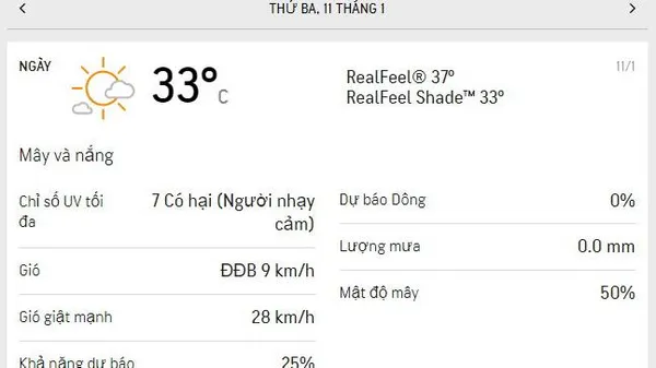 Buổi sáng Thứ Ba 11/1, trời nhiều nắng, ít mây; lượng UV cao nhất ở mức 7 (Nguồn: Accuweather)