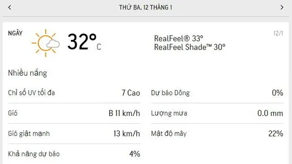 Chiều 12/1, nhiều nắng, nhiệt độ tăng nhẹ so với sáng, trong khoảng 30-32 độ C.
