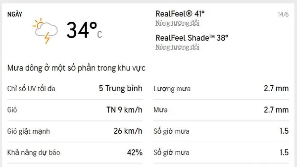 Buổi chiều 15/6, nhiều mây, vài nơi có thể có mưa dông lúc 15 giờ (Nguồn: Accuweather)