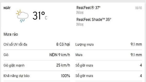 Buổi chiều 18/10, nhiều nơi có mưa rào rải rác từ lúc 15 giờ đến cuối chiều, lượng mưa trên 9mm (Nguồn: Accuweather)