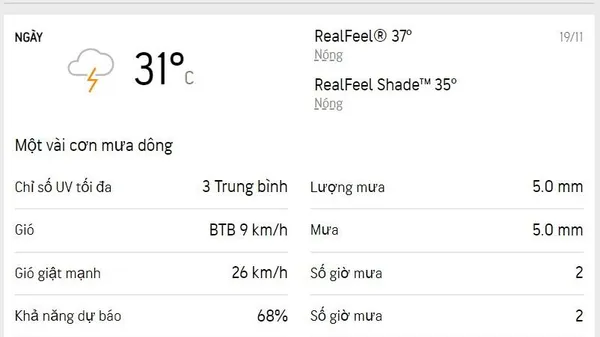 Buổi chiều 19/11 gió nhẹ, nhiều nơi có mưa dông rải rác lúc 13 và 18 giờ, lượng mưa ở mức trung bình (Nguồn: Accuweather)