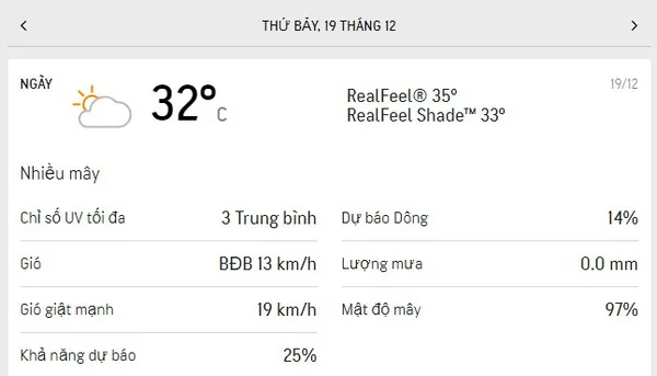 - Sáng Thứ Bảy (19/12), TPHCM nhiều mây, nắng dịu.