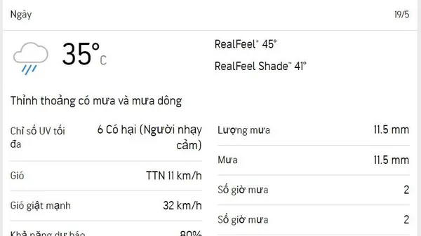 Buổi chiều 19/5 nhiệt độ tăng nhẹ dù trời ít nắng, nhiều mây và không mưa - Nguồn: Accuweather