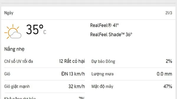 Nhiệt độ buổi chiều tăng nhẹ, khoảng 30-35 độ C, cao nhất lúc 13 giờ. Độ ẩm giảm nhẹ, dao động trong khoảng 45-64%