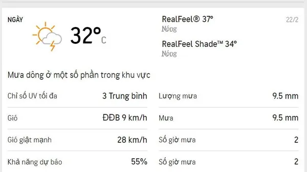 Buổi chiều 22/2 mát dịu, vài nơi có mưa dông rải rác lúc đầu giờ (Nguồn: Accuweather)