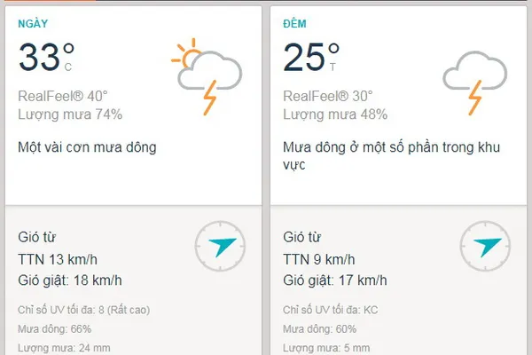 - Gió vận tốc 13-17km/h, hướng Tây Nam. Độ ẩm 72-92%.