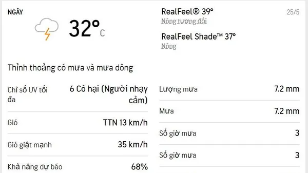 Buổi chiều 25/5, nhiều mây; mưa dông rải rác lúc 14- và 7 giờ (Nguồn: Accuweather)