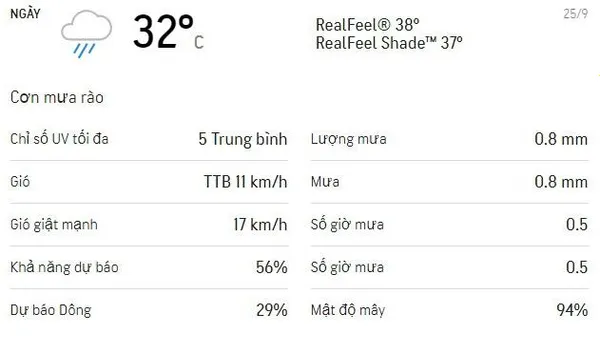 Chiều 25/9 trời mát, mật độ mây khá cao. Cuối chiều có thể có mưa rào nhỏ. (Nguồn: Accuweather)