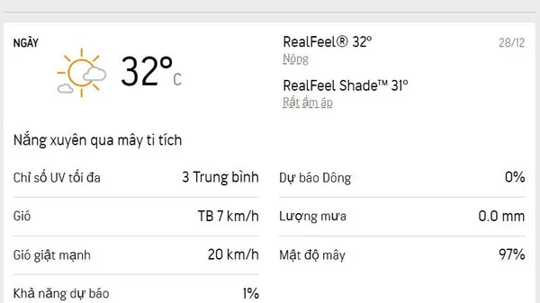 Buổi chiều 29/12, trời có nắng đến khoảng 15 giờ; độ ẩm không khí trung bình 46% (Nguồn: Accuweather)