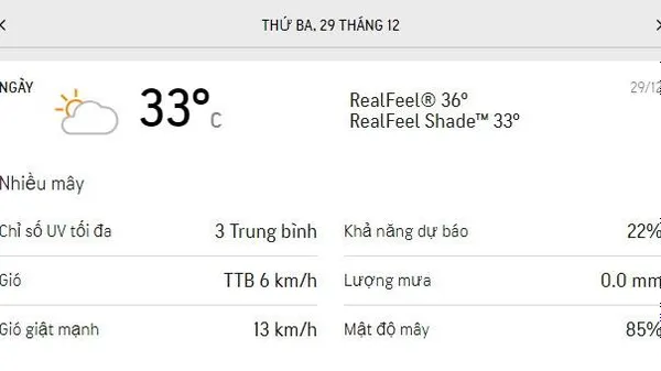 Chiều 29/12 trời khô, nhiệt độ cố định khoảng 32 độ C đến cuối chiều (Nguồn: Accuweather)