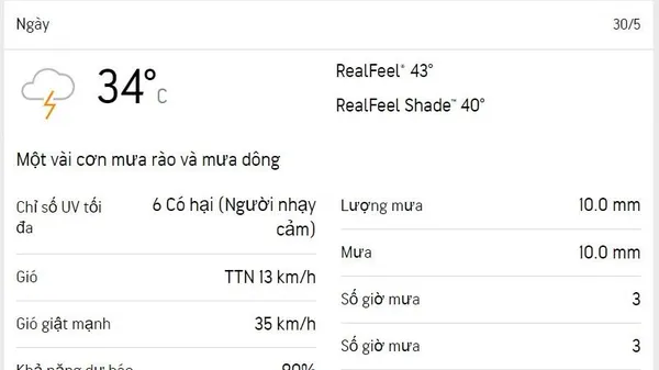 Buổi chiều 31/5, nhiều mây; mưa dông lúc 13 và 17 giờ. Đề phòng gió giật mạnh gây ngã cây, đổ gãy các bảng quảng cáo ven đường - Nguồn: Accuweather