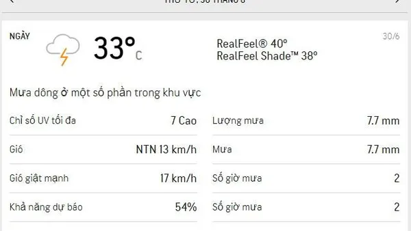 Buổi sáng 30/6, TPHCM nhiều mây, nắng dịu; vài nơi có mưa dông rải rác lúc 8 giờ. (Nguồn: Accuweather)