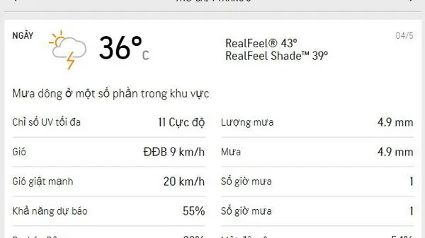 Sáng Thứ Tư 5/5 trời nắng nhẹ, mật độ mây trung bình 48%. Vài nơi có thể có mưa dông nhỏ lúc 12 giờ, lượng mưa 4,7mm.
