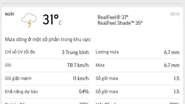 Buổi sáng 5/10, TPHCM có mưa dông thoáng qua vài khu vực, trời mát dịu; lượng tia UV cao nhất ở mức 3, khá an toàn (Nguồn: Accuweather)