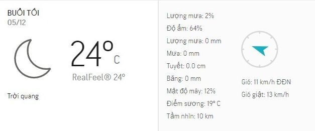 - Nhiệt độ tại TPHCM buổi tối và đêm nay (5/12) dao động trong khoảng 25 - 28 độ C.