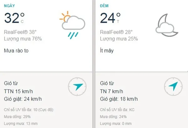 - Buổi trưa trời nắng gắt, nhiệt độ ngoài trời cao nhất 38 độ C, chỉ số UV cao nhất mức 10.