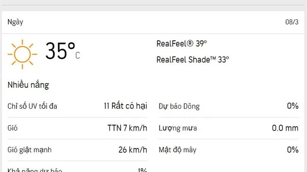 Sáng Thứ Năm, 9/3 TPHCM không mây, nắng suốt buổi; độ ẩm trung bình 58% (Nguồn: Accuweather)