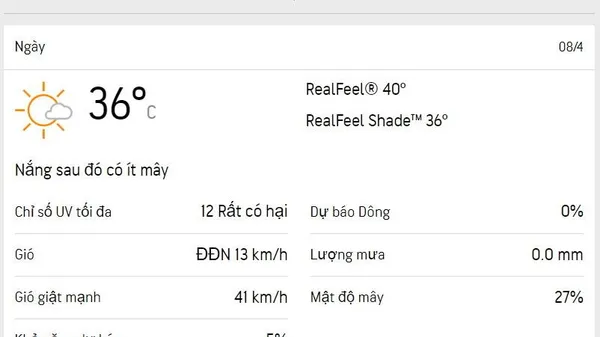 Sáng Thứ Bảy 8/4, trời ít mây, nắng nóng, lượng UV ở mức cực kỳ nguy hại - Nguồn: Accuweather