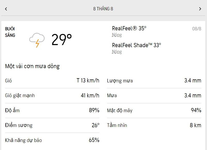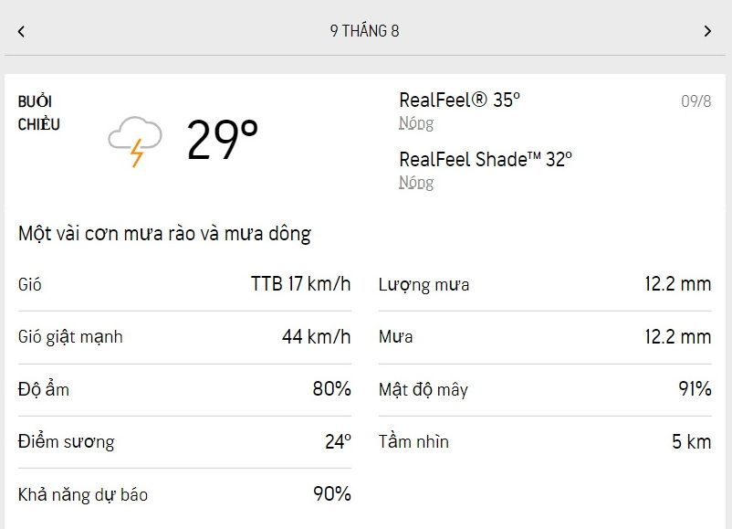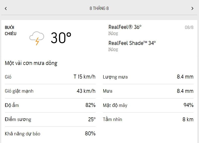 Buổi chiều 8/8, nhiều mây, khả năng cao có mưa dông lúc 15 và cuối chiều (Nguồn: Accuweather)