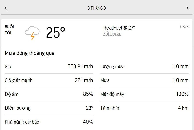 Buổi tối và đêm 8/8, nhiều mây; vài nơi có thể có mưa dông thoáng qua lúc 23 giờ.