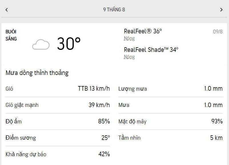 Sáng Thứ Ba 9/8 trời có mây, nắng nhẹ. Khả năng thấp có mưa dông rải rác lúc 7 giờ ở vài khu vực.