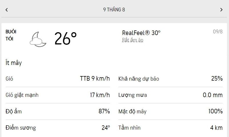 Buổi tối và đêm 9/8, trời nhiều mây, về khuya mật độ mây giảm dần; không mưa và có trăng mờ.