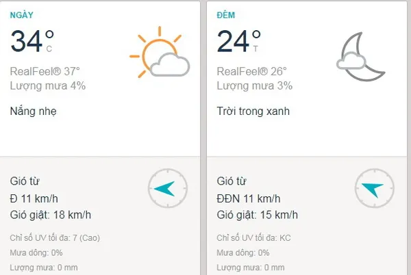 - Nhiệt độ dao động trong khoảng 24-32 độ C. Lượng UV cao nhất ở mức 7 lúc 12 giờ trưa