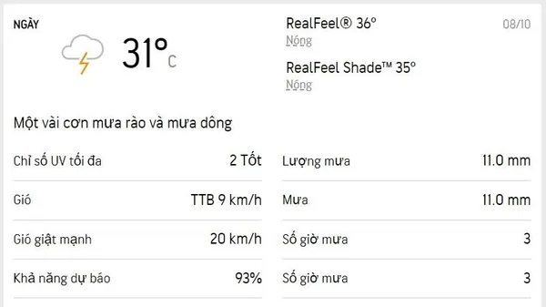 Sáng Thứ Bảy 8/10, TPHCM có nhiệt độ mát mẻ, lượng UV an toàn và ít mưa (Nguồn: Accuweather)