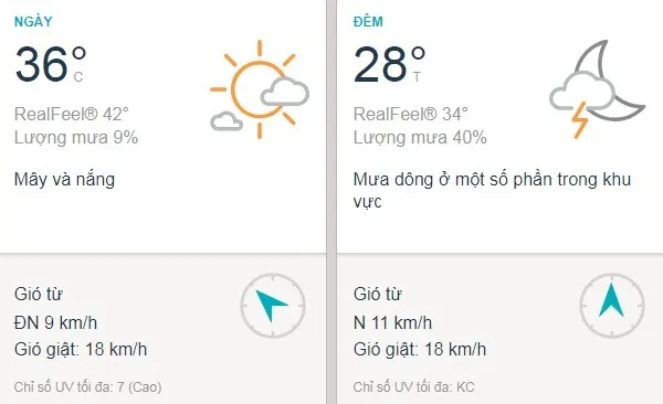 - Buổi chiều trời nắng gắt hơn với mức nhiệt ngoài trời cao nhất có thể tới 42 độ C. Trời không mưa, gió nhẹ.