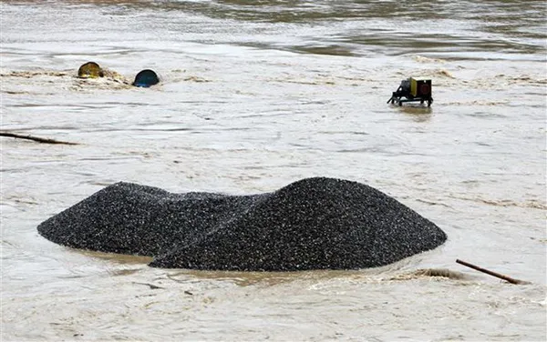 Nhiều phương tiện máy móc của đơn vị khai thác cát, sỏi bị chìm trong nước lũ. (Ảnh: TTXVN)