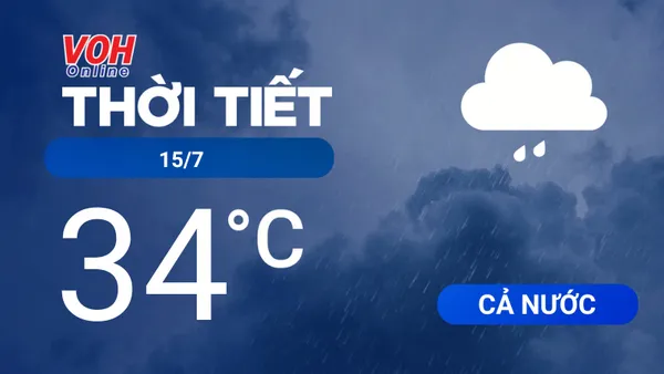 Theo Trung tâm Dự báo khí tượng thủy văn quốc gia, hôm nay - ngày 15/7, khu vực từ Nghệ An đến Phú Yên có nắng nóng, có nơi nắng nóng gay gắt với nhiệt độ cao nhất phổ biến 35-37 độ, có nơi trên 38 đô. Khu vực Bắc Bộ đêm và sáng có mưa vừa, mưa to, có nơi mưa rất to; sau có mưa rào và dông rải rác.
