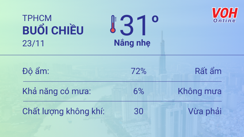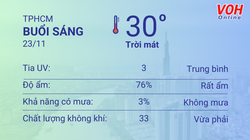 Sáng ngày 23/11, bầu trời TPHCM nhiều mây, dịu nắng, lượng UV cao nhất ở mức 3 lúc giữa trưa. Nhiệt độ buổi sáng dễ chịu, từ 26oC đến 30oC. Độ ẩm không khí trung bình 76%. Gió dưới cấp 1, giật cấp 2, hướng Đông Đông Nam, vận tốc 7-20km/h.