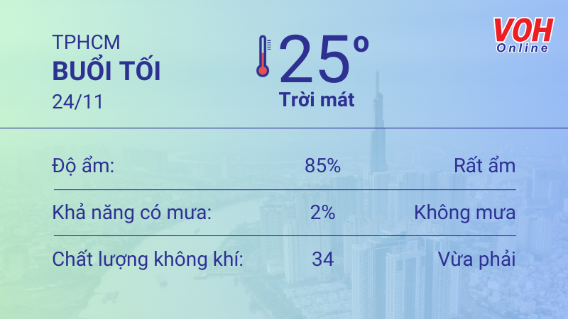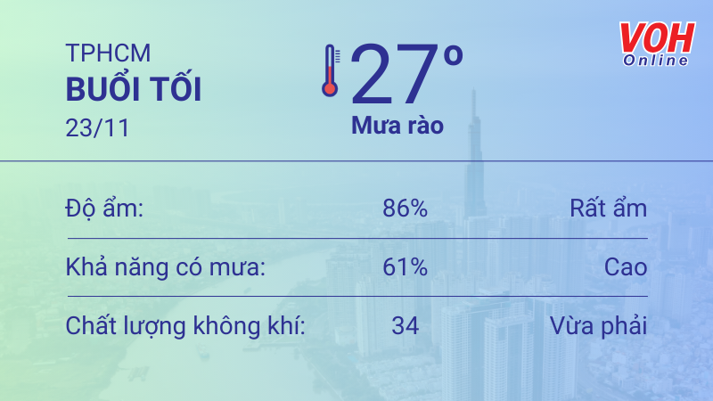 Tối 23/11, trời nhiều mây, nhiều nơi có mưa rào lúc 19-20 giờ, lượng mưa khá lớn. Nhiệt độ dịu mát khoảng 27-28oC, cá biệt có thể xuống đến 26o ở các vùng ven thành phố. Độ ẩm không khí trung bình 86%, gió nhẹ, vận tốc 7-22km/h, hướng Nam Đông Nam.