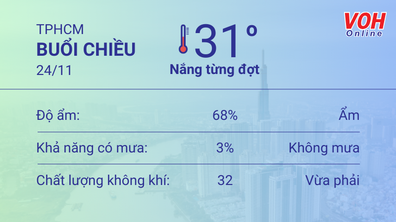Chiều 24/11, mật độ mây tăng nhẹ, trung bình 78%. Nhiệt độ buổi chiều trong khoảng 27-31oC. Độ ẩm không khí trung bình 68%, gió đảo hướng Nam Tây Nam, vận tốc 13-33km/h. Cuối chiều có nắng.