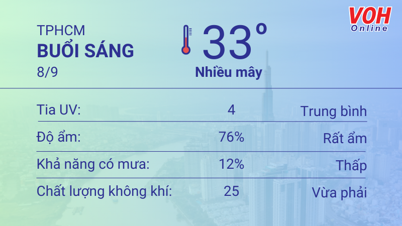 Thứ Sáu 8/9, TPHCM dịu nắng, cả ngày nhiều mây. Nhiệt độ buổi sáng trong khoảng 27-33 độ C. Giữa trưa lượng UV cao nhất ở mức 4. Gió hướng Tây, vận tốc 9-22km/h. Độ ẩm trong khoảng 68-96%.