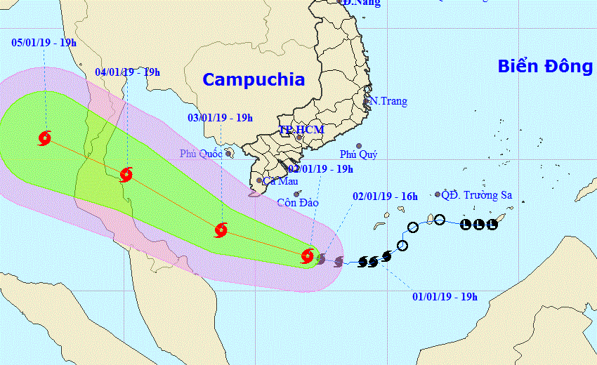 Dự báo trong 24 giờ tới, bão di chuyển theo hướng Tây Tây Bắc, mỗi giờ đi được khoảng 15km. Đến 19 giờ ngày 03/01, vị trí tâm bão ở khoảng 7,3 độ Vĩ Bắc; 103,7 độ Kinh Đông, cách mũi Cà Mau khoảng 170km về phía Nam Tây Nam, cách đảo Thổ Chu (Kiên Giang) khoảng 200km về phía Nam. Sức gió mạnh nhất vùng gần tâm bão mạnh cấp 8 (60-75km/giờ), giật cấp 10. Bán kính gió mạnh cấp 6, giật cấp 8 khoảng 100km tính từ tâm bão.