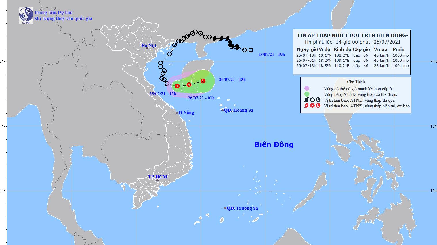 Dự báo trong 12 giờ tới, áp thấp nhiệt đới di chuyển theo hướng Đông, mỗi giờ đi được khoảng 10km. Đến 01 giờ ngày 26/7, vị trí tâm áp thấp nhiệt đới ở khoảng 18,2 độ Vĩ Bắc; 109,1 độ Kinh Đông, ngay phía Nam đảo Hải Nam (Trung Quốc). Sức gió mạnh nhất vùng gần tâm áp thấp nhiệt đới mạnh cấp 6 (40-50km/giờ), giật cấp 8.